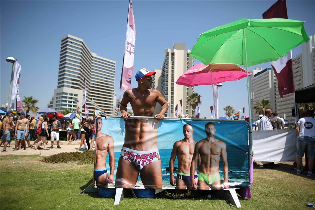 A man behind stands behind an underwear banner during the annual Gay Pride Parade in Tel Aviv, Israel, 13 June 2014.